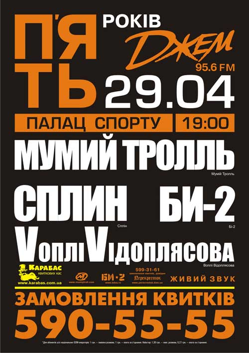 5-летие ДЖЕМ FM с Празднуем вместе с: «Мумий Тролль», «Би-2», «Сплин», «Воплі Відоплясова». Также спецальные гости! Живой звук.