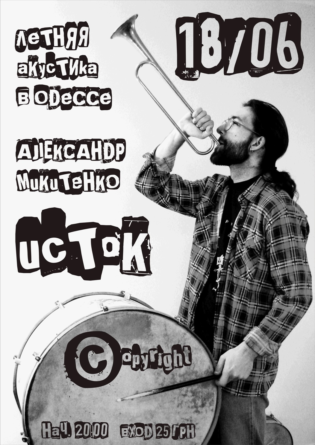 Александр Микитенко, рок-музыкант из г. Одессы, лидер группы "ИСТОК". Группа была образована в 2001г. , начинала творческий путь в традициях русского рока, постепенно экспериментируя со звучанием, привнося в него в разное время элементы акустики, панк-рока, гранджа. С 2003г. вела активную концертную деятельность (Украина, Россия, Белорусь, Казахстан, Молдова, Приднестровье), являлась одной из ведущих андеграундных украинских рок-групп. В 2005-2008 г.г. А.Микитенко занимался концертно-организаторской деятельностью в Одессе и Украине, при его непосредственном участии в этот период прошли концерты лидеров большинства интересных российских андеграундных групп (Черный Лукич, "Телевизор", Ермен "Анти" ("Адаптация"), Вадим Курылев и др.) и 3 акустических фестиваля независимой музыки "Рок-сессия" в Одессе. В 2008г. "ИСТОК" прекратил свое существование, как одесская рок-группа и с 2010г. стал представлять собой одесско-петербургский проект Александра Микитенко (гитара, вокал), Михаила Нефёдова (барабаны, участника гр. "Алиса", "Разные люди", "Электрические партизаны") и Максима Зорина (бас, участника гр. "Разные люди", "Электрические партизаны", "Ливень"). Дискография группы включает в себя 3 "самиздатных" акустических альбома и 2 полноценные работы, последняя из которых, "Выдохновение", была записана уже в Санкт-Петербурге в 2009 - 2010 г.г.