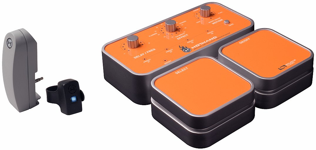 У басиста на пальце электронный контроллер для управления примочками компании SOURCE AUDIO