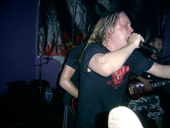 Тем временем публика подтягивалась.Подъехали фэны из Одессы и даже из Измаила и Приднестровья. Присутствовал даже нынешний ударник москвичей Коррозия Металла. Народу собралось прилично,но всё же не так много как в первый приезд MUCOPUS. Открыла шоу группа из Белгород-Днестровского SANGFROID. Они уже играли в Ильичёвске года 3 назад. Было это ещё в "Двух капитанах" и тогда это было трио с драматиком и с Аленой "Хельд" на басу. Сейчас в группе людей прибавилось, барабаны уже "живые", а Хельд уже давно живёт и играет в Киеве. SANGFROID играют традиционный блэк метал, что для разогрева публики прокатило вполне.