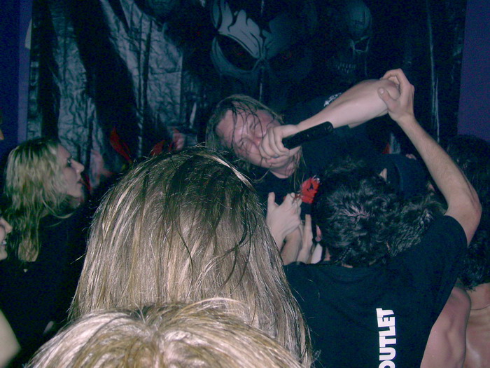 Наконец настал черёд хэдлайнеров вечера. В перерыве многие из фэнов вышли на перекур. Недовольный количеством публики в зале Джейсон схватил микрофон и прихватив меня с собой выбежал на улицу. Тут мы начали горлопанить на все лады зазывая зрителей в клуб. И вот выступление MUCOPUS началось. Это надо было видеть! Всё таки заокеанская подача материала разительно отличается от европейской. Джейсон буквально ходил по головам хэдбенжеров, бегал по столам, метался по сцене и постоянно требовал от публики устроить мошпит. Джастин сотрясал стены мощными риффами, а ритм -секция