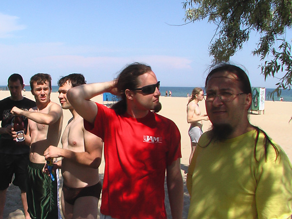 Утром, получив звонок от Степана, я вышел из дому.Через пару минут бус с музыкантами прокатился мимо. Рядом с водителем сидел Степан и вокалист Flying Виктор Озолин. Поприветствовав друг друга мы отправились по своим делам - музыканты в гостиницу, а я на погрузку аппарата. Прибыв к нашему "звукачу" Капитону, был обнаружен новый комплект звуковой техники мощностью в 8 кВт. Пока мы его выволокли на улицу, подкатил Степан и наёмный микроавтобус. Пришлось делать две ходки. К тому времени когда мы истекая потом завершали установку колонок, приехала и "Газель"с группами MUCOPUS и FLYING. После того как они оставили в клубе вещи и инструменты все отправились на обед в паб "317". Откушав борща и тефтелей, а также причастившись пивом было решено двигать на море, благо денёк выдался по словам Джастина (гитариста MUCOPUS) - perfect. По дороге на пляж гости наперебой восторгались проходящими мимо девчонками, а барабанщик американцев Кайл прикололся с мусорных урн в виде пингвинов. На пляже вся компания попивала пиво и в большинстве своём купались. Из американцев, правда купались только Кайл и басист Кори. Джастин загорал, а вокалист Джейсон вообще не снимая майки отсиживался в тени. Flying'и шумно плескались, а их барабанщик Макс здорово плавал брассом, не иначе занимался плаваньем. За пивом Кайл распевал ''We are american band" Grand Funk Railroad, а все продолжали обсуждать всяческих "гёрлз", коих вокруг загорало изрядное количество. У Джейсона на поясе была прикреплена целая колекция бейджиков с различных гастролей и фестивалей. Надо сказать, что он так же является певцом групп Detriment и весьма популярных Skinless. Именно по причине занятости в Skinless в прошлый приезд его подменял Адам, который впрочем то же горлопанит в двух штатовских командах.