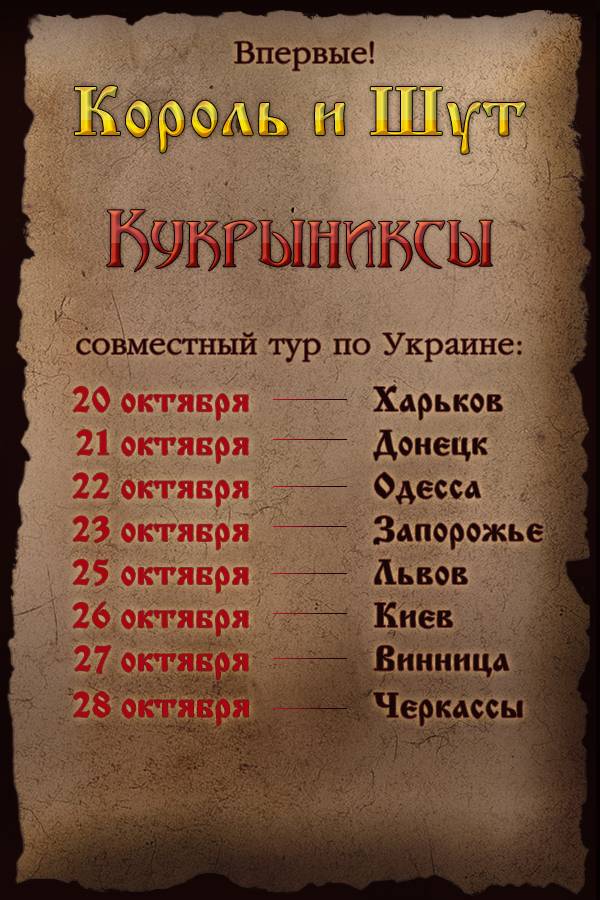 Группы «Король и Шут» и «Кукрыниксы» отправляются в первый совместный тур по Украине. С 20 по 28 октября они посетят Харьков, Донецк, Одессу, Запорожье, Львов, Киев, Винницу и Черкассы. По словам музыкантов, на это турне их подтолкнула родственная связь – как все давно знают фронтмены «Короля и Шута» и «Кукрыниксов» «Горшок» и «Ягода» родные братья. До этого на различных фестивалях группы не раз выходили на сцену вместе, а как только появилась возможность организовать совместное «братское» турне, они тут же ее осуществили. Еще один лидер «Короля и Шута», «Князь», поделился с нами, какую программу увидят украинские зрители: