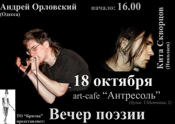 Кита Скворцов - лидер(ой бля, организатор))) николаевской творческой организации "Листы Поэтов". Читал Много. Читал не очень хорошо. Но ЭТИ стихи местами более чем хороши. Реальность. Так сказать. Настоящая(как кто-то там его охарактеризовал).