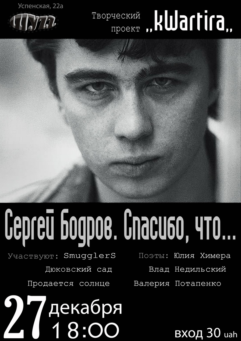 Творческий проект "kWartira" представляет, впервые в Одессе, Вечер памяти выдающегося актера, режиссера и кумира многих - Сергея Бодрова-младшего. В программе много хорошей музыки из фильмов с Сергеем Бодровым, выступление известных одесских поэтов, просмотр "Брата-2" и много-много теплых слов в Его честь...