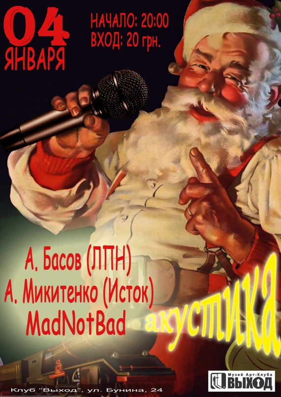 4 ЯНВАРЯ 2012 состоится НОВОГОДНЯЯ АКУСТИКА в Музее Арт-Клуба "Выход" (ул. Бунина, 24).
