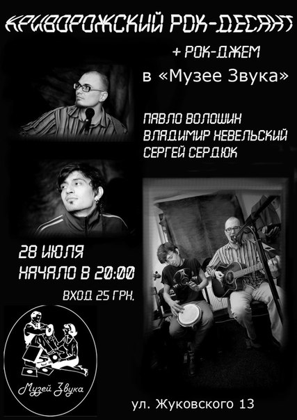28.07 в гостях у "Музея Звука" рок-группа из Кривого Рока, Криворожский рок-десант! Творчество группы ориентировано на людей, открытых душой, тех, кто любит серьезную рок музыку, настоящую поэзию, смешение стилей, кто знает, что сначала душа, а уже потом все остальное.