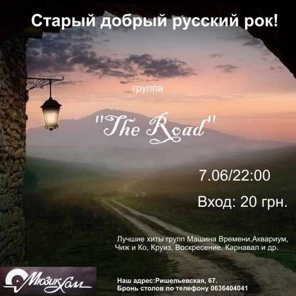 Самые добрые и светлые песни из далекого советского рока!! Это было так давно, но все равно эти песни хочется слушать снова и снова! Именно эта музыка объединила группу одесских музыкантов разных возрастов- от молодых ребят, которые только начинают свой музыкальный путь, до метров одесской музыки с недюжинным опытом выступлений в различных коллективах Одессы! Итак, в эту пятницу , для Вас играет коллектив "The Road". Приходите на хорошую музыку, пойте с нами, танцуйте, наслаждайтесь жизнью!